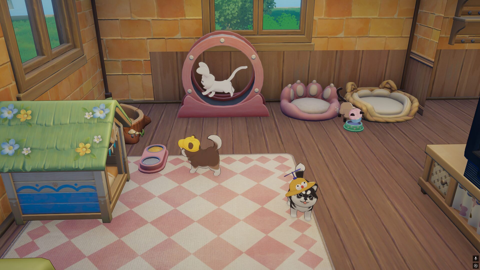 家にはペットボウルやランニングマシン、ペットハウスを用意し、彼らの空間を作ってあげましょう。そのほか、ペット専用の衣装も用意されています。